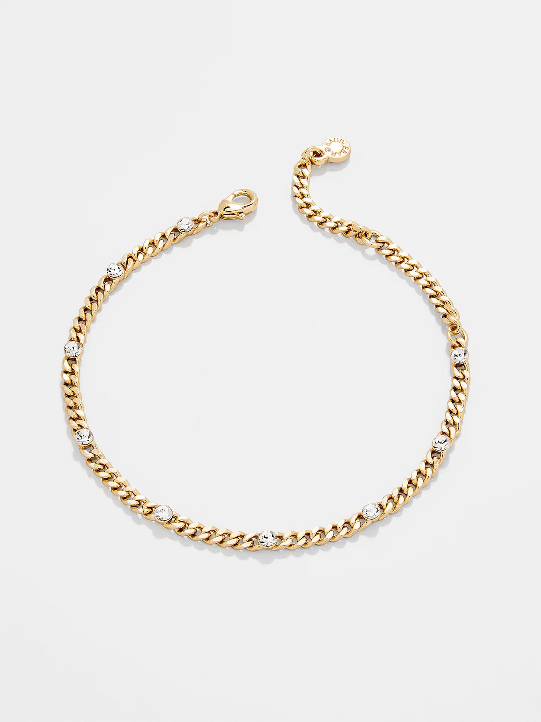 It would be a mistake not to have a curb bracelet to turn to in your accessory collection. Lending just the right amount of gold, crystal, and chain to any wrist stack, the Cassandra Bracelet is the ideal addition to every single outfit. Gold plated brass.